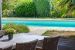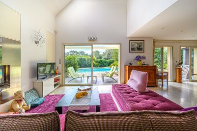 Upstairs, the mezzanine above the living room serves a spacious and bright master suite with two dressing rooms and bathroom (shower and bath) and a terrace with a view of the garden and the swimming pool, then a second very large bedroom with walk-in closet.