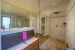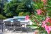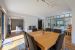 - Vaste pièce de vie : Un grand salon et une salle à manger sont harmonieusement délimités par une élégante cheminée centrale, créant une atmosphère chaleureuse. Cet espace s'ouvre généreusement sur la terrasse qui borde la piscine, invitant à la détente et aux réceptions estivales.