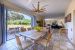 La partie principale comprend un vaste séjour-salon de 100 m² face à la mer, baigné de lumière grâce à de grandes baies vitrées, une cuisine spacieuse, une chambre avec salle d’eau et une bibliothèque. À l’étage : deux grandes suites avec dressing et salle de bains, ainsi que deux autres chambres et une salle de bains.